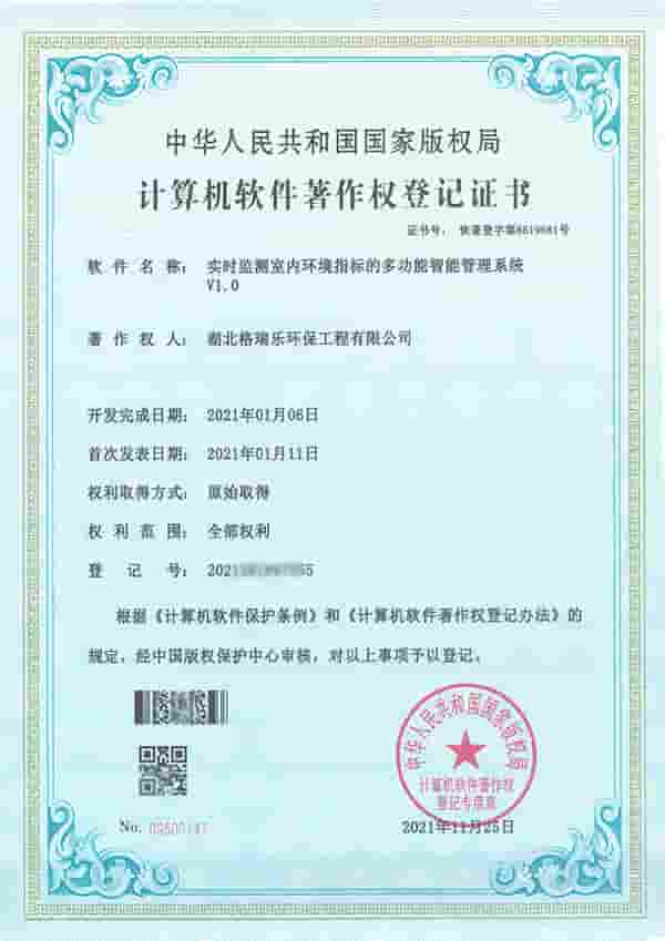 近日湖北格瑞乐环保工程有效公司成功获得一项计算机软件著作权。软件名称为:实时监测室内环境指标的多功能智能管理系统V1.0。根据《计算机软件保护条例》和《计算机软件著作权登记办法》的规定,经中国版权保护中心审核,我公司被认定为这个软件的法定著作权人,从颁证之日起,其版权将得到“中国版权保护中心”的有效保护。